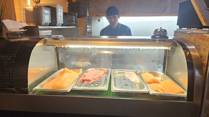 המסעדה מעוצבת באיפוק עדין ושקט משרה ביתיות והמון חום. בצד השמאלי יש את פס הסושי עם שני מקררים פתוחים ובכל צד עומד סושי מן, וראיתי נתחי דגים של סלמון, טונה אדומה ודניס. נתחים גדולים ויפים מאד. (בתמונה מקרר אחד יש עוד אחד )