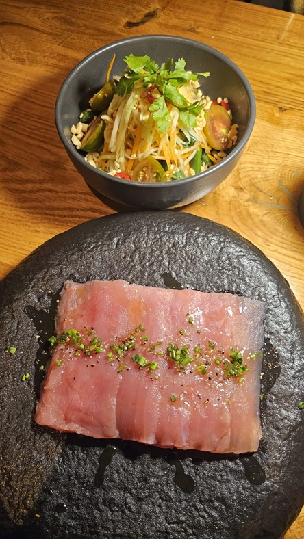 סלט סוס טאם תאי – פפאיה ירוקה, שעועית תאילנדית, גזר, עגבניות שרי, כוסברה, בוטנים וצ'ילי ברוטב סיאם מתוק-חמצמץ. לדעתינו היה חסר רוטב,