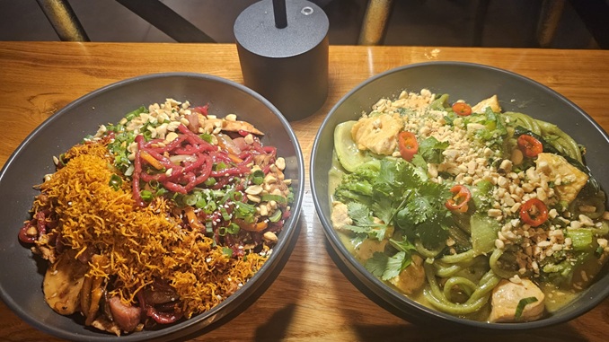גרין קיוטו – אטריות חיטה תרד, קארי ירוק, קרם קוקוס, בזיל תאילנדי, נענע, ברוקולי, באק צ'וי, בצל ירוק, בוטנים, וכוסברה.
