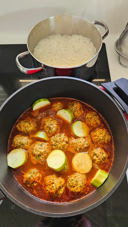 הכנתי תבשיל של כדורי עוף ברוטב עגבניות, מנה הכי פשוטה שאני נוהגת להכין. אין צורך להוסיף פירורי לחם או ביצה. הוספתי בצל קצוץ ופטרוזיליה קצוצה, תבלינים מלח, פלפל וכמון ערבבתי היטב יצרתי כדורים ובישלתי ברוטב עגבניות.